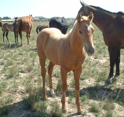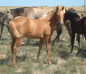 | 'Nugget' is a very well bred filly, and it shows. I am forever grateful to have had the opportunity to have leased her dam HP Miss Kitty O Lena, who is by Doctor Wood out of a King Ranch mare, to breed to Golden Dually. What a great cross it is! She was pink with a pink dorsal stripe and now is a beautiful golden palomino with a white mane and tail like her daddy. She is very easy going and sweet to work with. She just keeps getting better. |